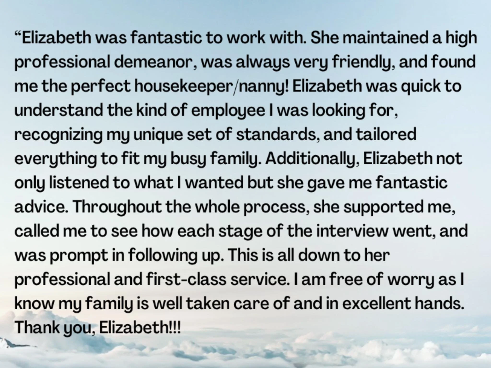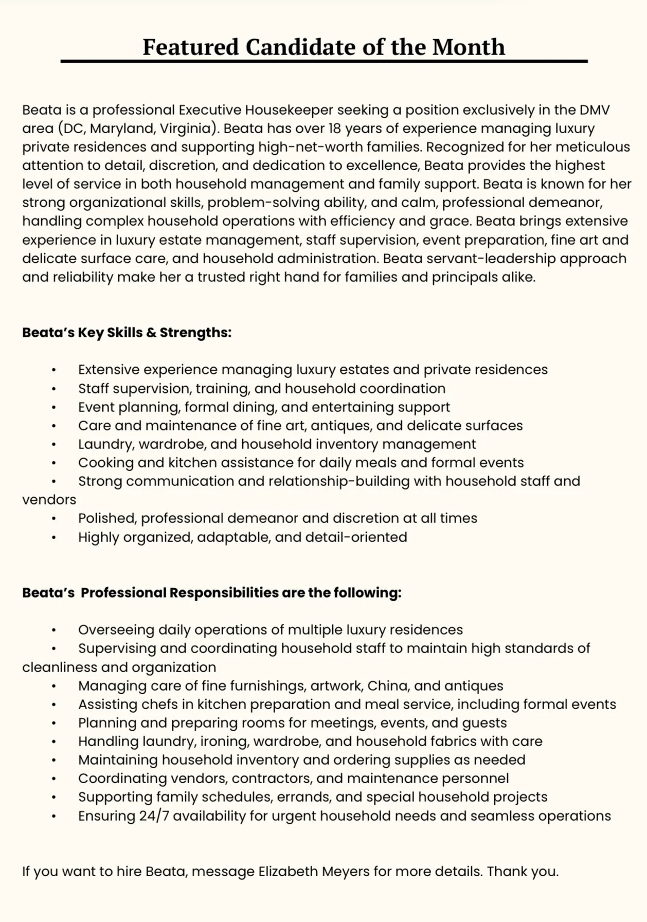 L&J STAFFING COMPANY CONTACT US: WHY L&J STAFFING COMPANY?Trustworthy and Reliable Domestic Staffing Company for your Family’s needs. We can provide the best services! Professional Nanny Professional Newborn Care Specialist Professional Housekeeper Professional Chef Professional Personal Assistant Clients Testimonial Alina G- San Francisco California Kelly K- Jupiter Florida Tami R.